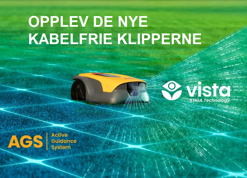 helt ny robot klipper fra al-ko uten kant tråd. robot styres av kamera. robot klipperen tar inntil 1000 m2 plen