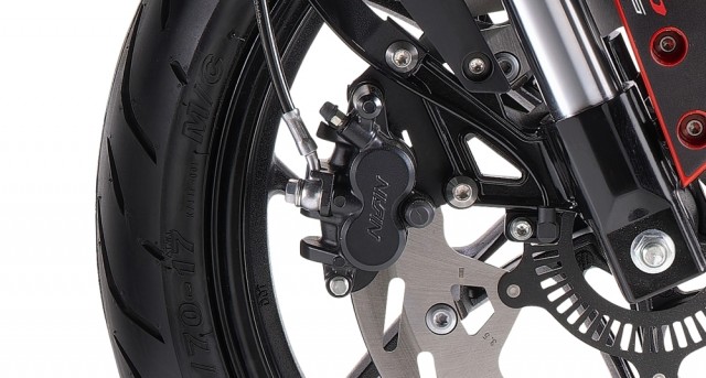 - Forbrems ABS og TCS; Nissin kaliper med dobbel stempel; Skive Ø320mm.